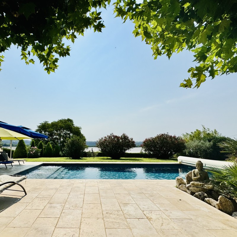 • Piscine chauffée avec système PAC (10m / 5 m) avec liner neuf, plage en travertin, volet électrique