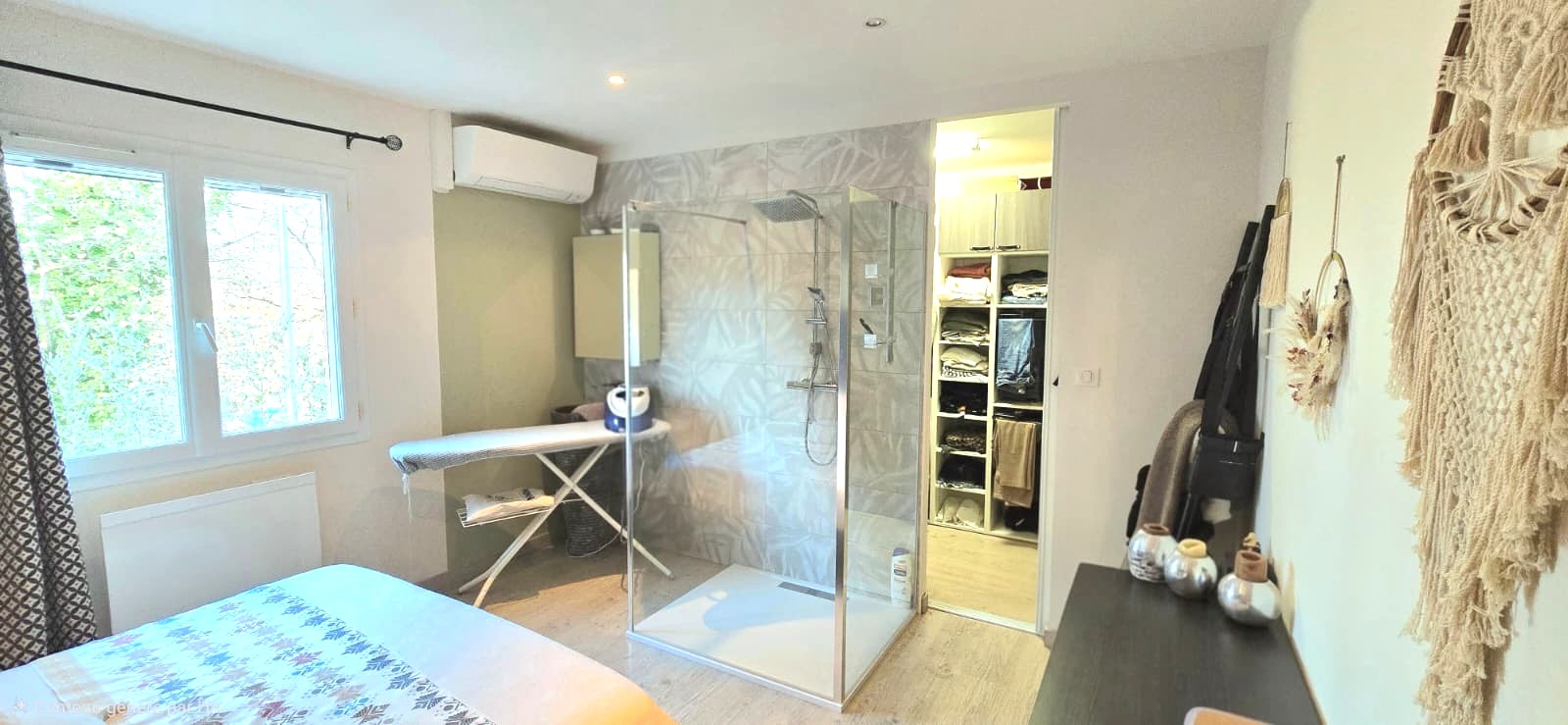 La maison bénéficie de prestations de qualité : climatisation, radiateurs à inertie, menuiseries PVC double vitrage et volets PVC.