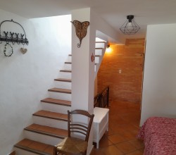Le niveau intermédiaire accueille un salon chaleureux, doté d'une cheminée ouverte qui apportera convivialité et atmosphère cosy durant les soirées fraîches. Au rez-de-chaussée, deux chambres en enfilade permettent une circulation fluide, accompagnées d'une salle d'eau.